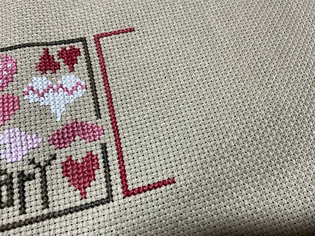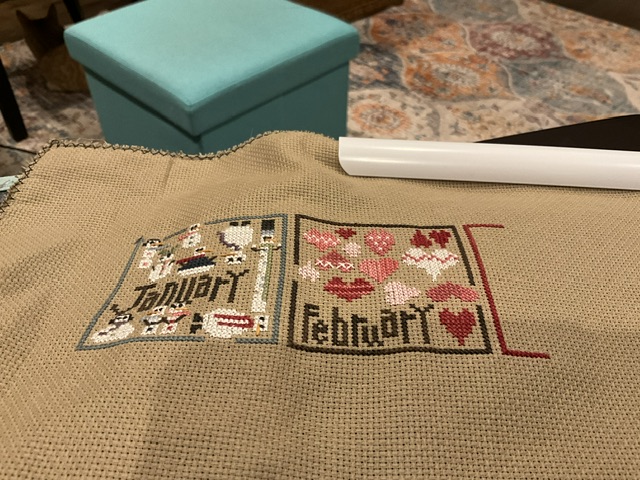 Instead of stitching each pattern as a standalone, I decided to stitch them together. Since, I almost forgot to pull this one out, there is only a few stitches in this new start for March – the border. I am using called for floss. This is on 16 ct dirty aida but this photo doesn’t correctly show the colors. Viola! This week’s start!