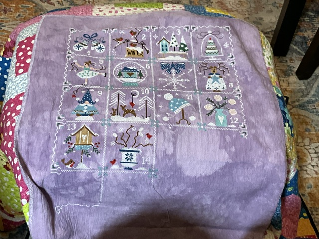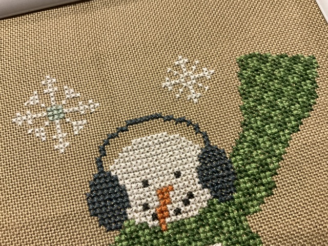 While this one is moving along well, the speed of stitching is more of what I normally experience when stitching 2 over 2. This is 25 ct lugana and should be easy peasy, but I find I will have miscounted somewhere and I have “to make up” for my mistake. I have completed the body and head of the snowman. I just have his broom arms to finish. This is so sweet to work with.