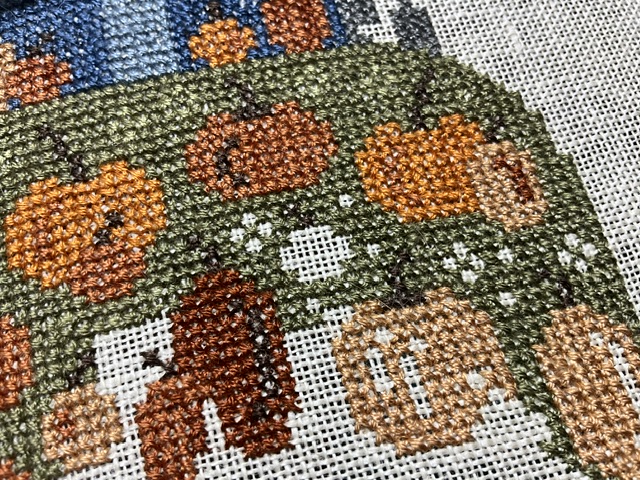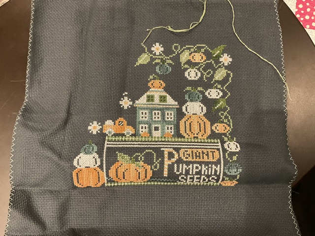 I had a hard time putting this one down this month. I have finished everything on the right and in the middle. I just have the left side to finish. Looking so good that I impressed myself. I think the blue pumpkins are a nice touch.