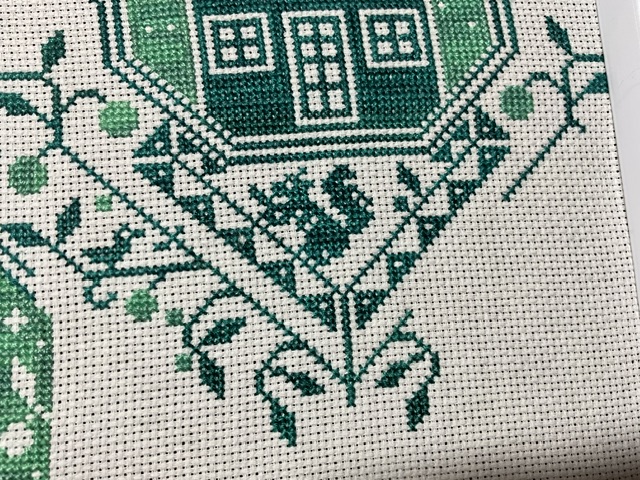 I just had to work on the squirrel under the house. He was just too cute to resist. How fitting to work on his vines as well. Almost finished with this center motif. This is stitched on 16 ct white aida with Weeks Dye Works Lagoon and Ismeralda. Such beautiful color. I kind of wish I had used black because despite my best efforts, the oil from hands are showing up on the cloth. I was so careful, but (sigh) it still happened. I will have to do some research on how to carefully clean the cloth. If anyone has any tips, or places to look, please leave them in the comments. I am 80% done with this jumbo project of 42,000 stitches. I am currently working on page 8 (of 9). Love working on this project!