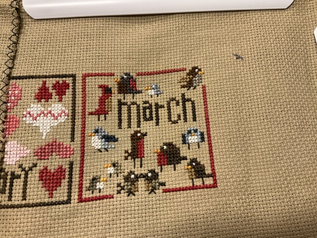 I wrapped up March in my Yearlong Square Dance. I like all the birds instead of the normal four leaf clovers for March. Very cute. They were a lot of fun to stitch. I think it is cool that each border is a different color as well.