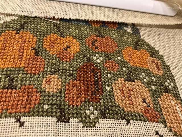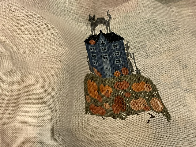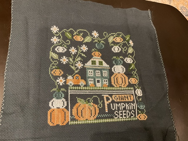 Woohoo! I hit my goal of 2000+ stitches when I finished with 2,020 stitches. I have really enjoyed working on the hill this week with all the pumpkins. The shading has been awesome.