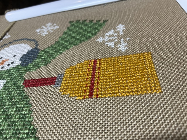 This week I added the broom end of the broomstick and a few snowflakes. I also realized I forgot to add the fringe on the scarf so that was added as well. I have one more night and I will have hit my WIPGO goal.