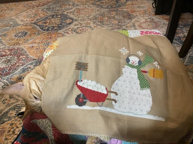 My August goal will be to work on it five days or to finish it whichever comes first. There are a few sheep and snowflakes left to do as well as finishing the Snowman’s head.