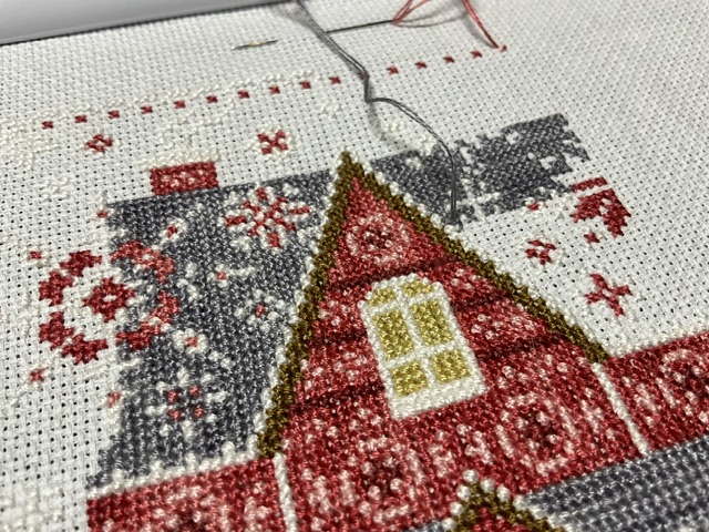 I continued filling in the snowflakes on the roof as well as the roof itself. The snowflakes have been surprisingly challenging. I am not sure what is making it a challenge but definitely has slowed me down a bit. I also worked a little on the border.