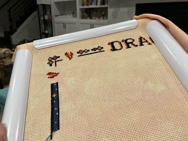 I am still catching up on my June WIPGO goal of 1000 stitches. I was able to add to my stitch count this week while working on page 1 of the chart. I am up to 769 stitches. Still have a ways to go. I am ready to start on the first dragon.