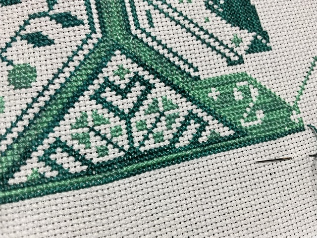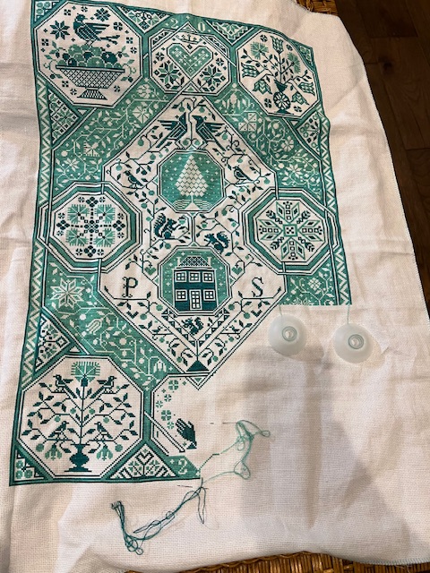 I really get lost in this piece now that I am so close to finishing it. This project was my first intoduction to a multi-page pattern. There was a steep learning curve. I love all the old time feel and am looking forward to finishing this one next year. I plan on having it professionally framed when it is finally done.