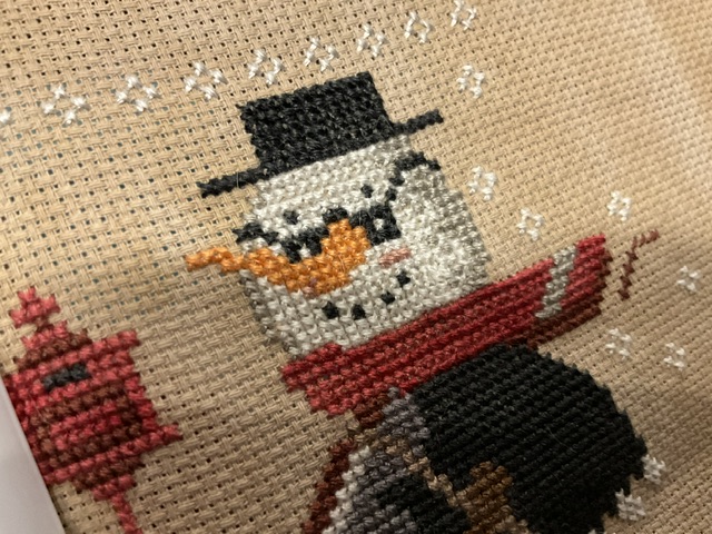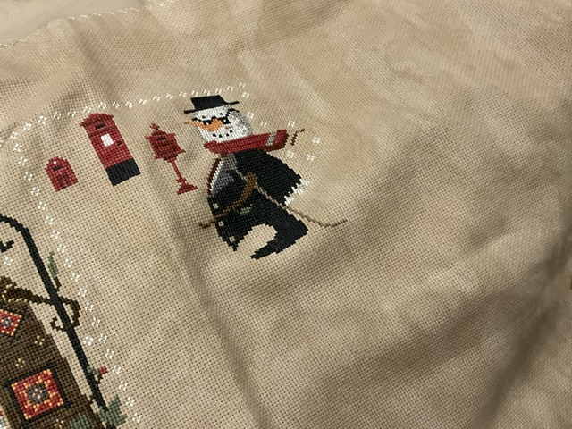 I got really excited when I decided to work on his head this week. I finished off most of his scarf and ALL of his head. The spectacles are such a charming touch to this studious snowman out delivering love letters. I could not put this down until the last stitch was on his hat. 💌. I am stitching it on 18 ct vintage country mocha. It was suggested to me by 123 stitch. I gotta say this is one of my favorite fabrics now.