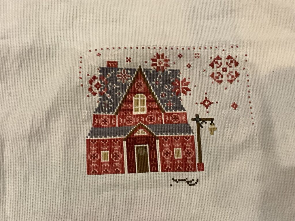 This project is stitched on a very stiff 20 ct linen with 1 strand of DMC pearl cotton over 2. I use a 24 needle and seems just fine. I was having issues knowing where the top and bottom were until I finally stitched the little gingerbread guy. The kit comes with the pearl cotton. It doesn’t say what size of pearl cotton but I think it is 5. I don’t think it is 10 which I remember being much finer thread and it is not nearly as thick as a 3.