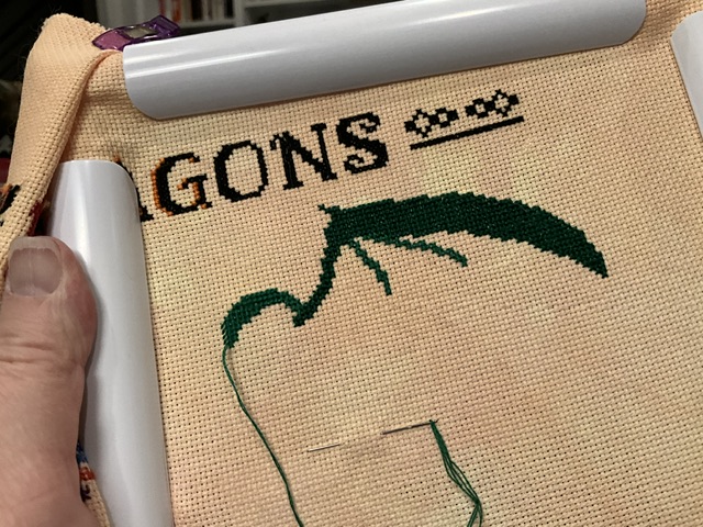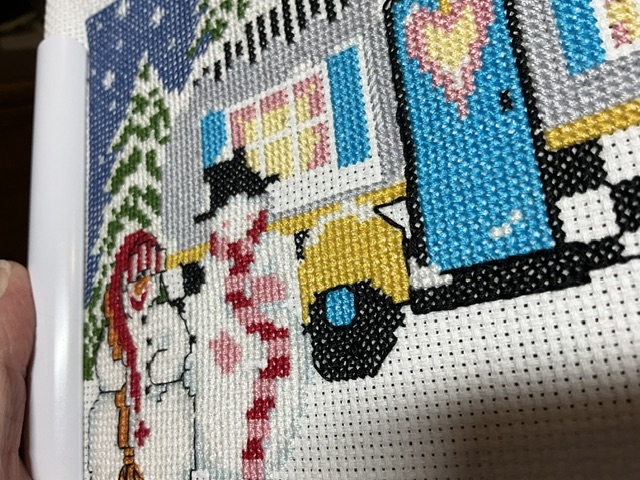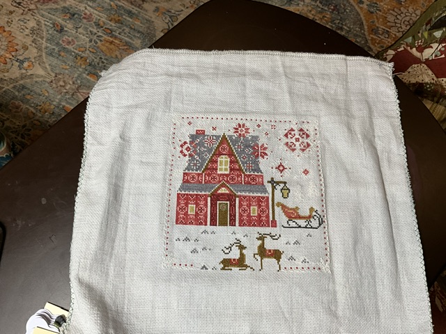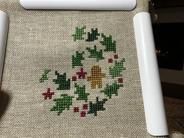 New Year’s Day, I pulled almost every Christmas project to put back in the closet. This is one I kept out. I ended up working on things in the sewing studio so by the time I finished dinner, it was well into the evening. I still needed to go for my walk. I only got 375 stitches on it last night. I am determined to finish it this week so it is staying out.