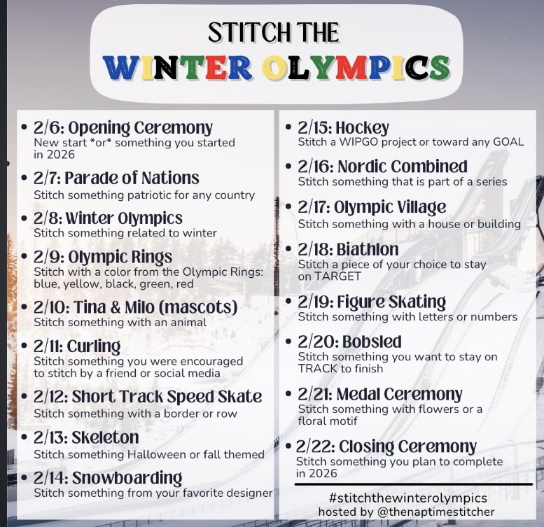 Trying to keep my expectations manageable. I tend to think I can do more than I can. With the Olympics starting tonight, I should have more stitching time. I choose not to participate in the Winter Olympics Cross Stitch but I could change my mind. In case you are interested: