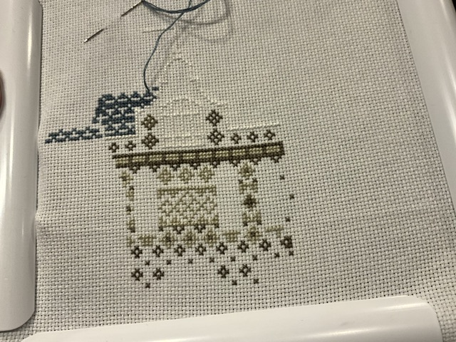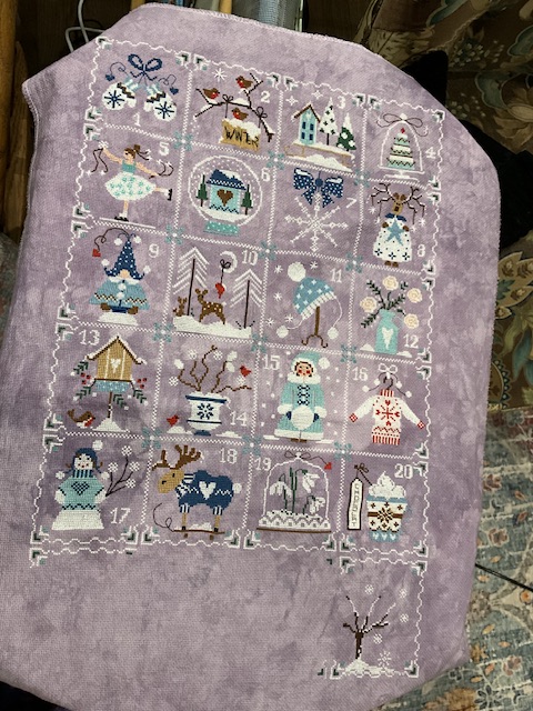 I had a bit more time to work on this one. I finished up my center snowman and even started a second while working on the “ground”. Love this ground stitched in a deep blue. Say “bye”. This one will be heading for the archives until next winter or gets called for in WIPGO.