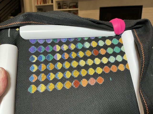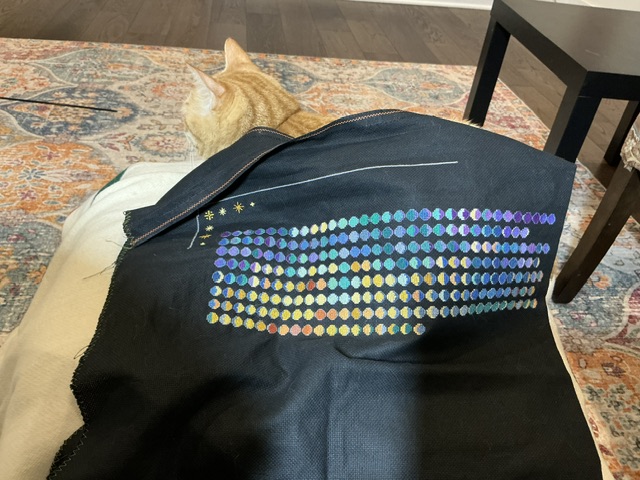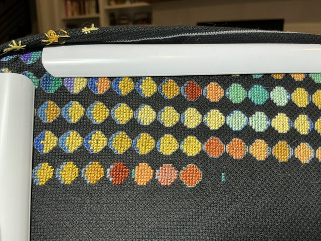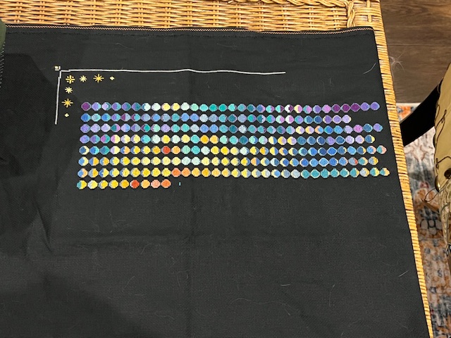 I worked multiple evenings on this project this week. I gave myself an hour each night and found that I was finishing 3 moons if I didn’t outline them. Once I got to a new moon, I went back in outlined all the moons before it. That seemed to work well for me. Backstitching is not my favorite thing to do. Caitlin said she is not going to outline. I tried it, but didn’t like how it looked. I am using DMC 317 which a dark medium gray. It doesn’t stand out but the moons do.