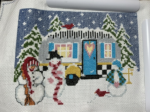 Sorry. For some reason, I didn’t take a overview photo of this project this week. I think I intended on coming back to it before I posted to you. This footer for Winter is 4 “squares” across. I am almost half done with it. The goal is to finish it in January (LOL!). I am still plugging away. I am looking foward to finishing this gorgeous project. I looked at her other seasons. I am not sure if I want to do them. I have other things I want to do more.