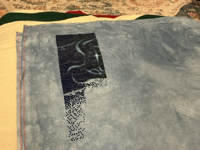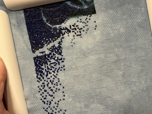 I am stitching on 20 ct aida by Fiber on a Whim – Ocean Blue. While it is not gradient like the ocean (light to dark), I am very pleased with the color. My friend was very clever and she painted her white aida to be gradient. It looks great. I do think I need to buy some special readers and find my #28 needles for this project though.