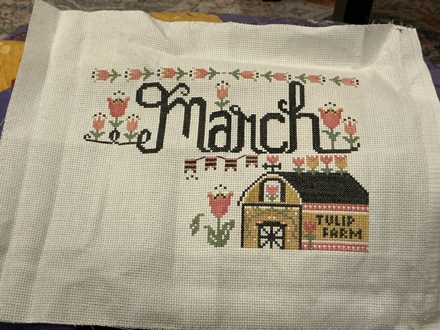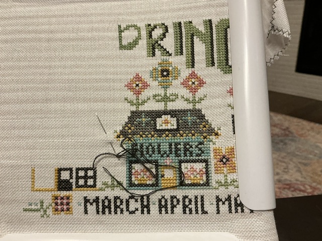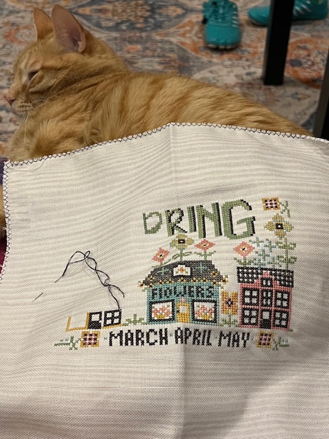 I have been plugging away at this one. Might just finish this one next month. Maybe. It is so much fun stitching on spring things. It really gets you in the mood for Spring.