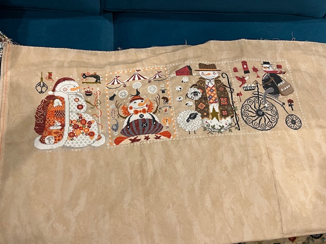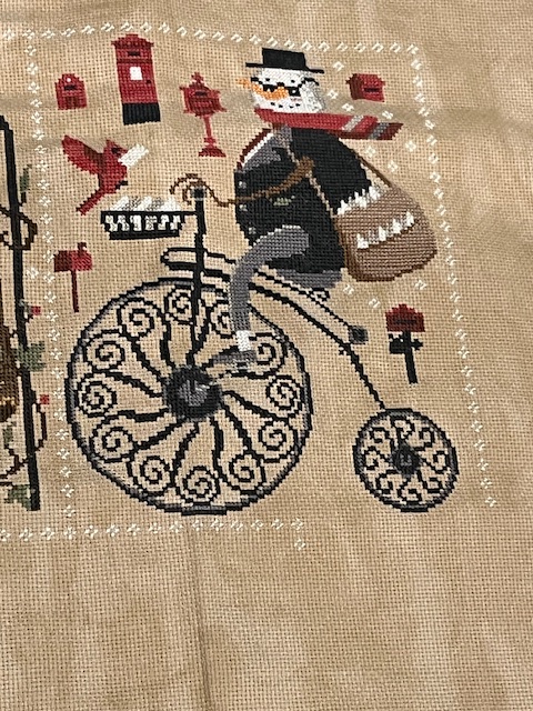 It felt so good to finish my fourth of this series – Snowman Collectors. It was quite fun to work on this guy. All those mailboxes and the cardinal…. How about that bike? Can’t wait to start the next one.