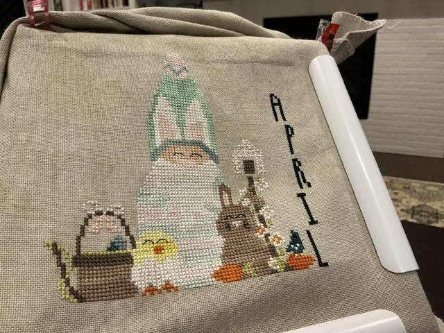 I am not sure it is going to get done this month but it will not be going back in the closet until the stitching is done! I enjoyed adding the backstitch for the faces for my gnome, bunny, and chick. It really adds a lot of character. Still alot left to do. Looking forward to working on it some more.