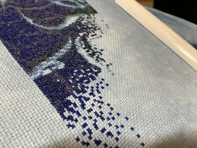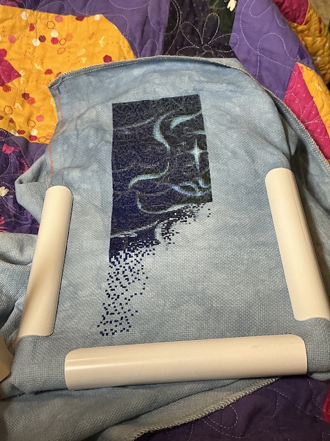 I am not sure if you caught my last post here but I spent the weekend in Bend, Oregon with my daughter and son-in-law. We all did the Salmon Run. For more details, check out the last post. Anyway, I took this with me thinking I would have time to work on it. Well I did have time, but no energy. It just sat on the couch in the hotel and made me feel guilty. 🛋️ When I got home on Sunday, it was still calling my name. Despite being very tired, I put in 200 stitches towards my 2000 goal for this month. I know it is laughable 🙊