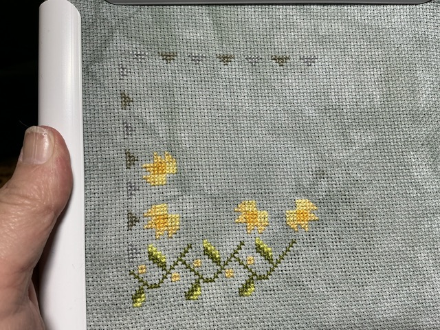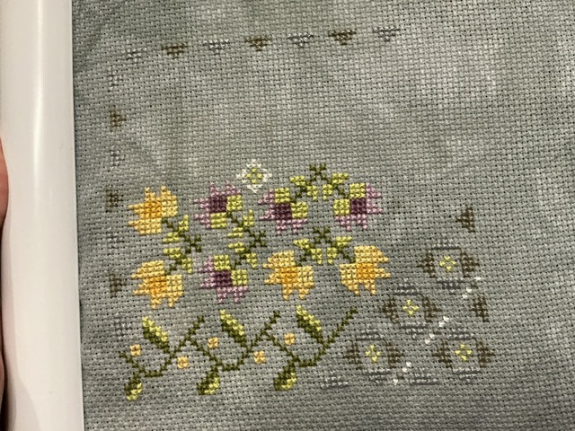 I was cooking along thinking things were going great. Well they were going great until I realized my two yellow flowers were seperated by 3 instead of 5 and the stems wouldn’t work. I ended up having to take out almost everything I had done PLUS all the diamonds and greenery on the right. I did not want to, but I had to. I kept thinking about this project and just could not resist restitching everything I took out and even added some purple flowers. I have 4 more yellow flowers and 4 more purple flowers plus one more leafy vine. The draw is strong to wrap this one up. It is the last chart for spring as well as the last one for the whole series to be done.