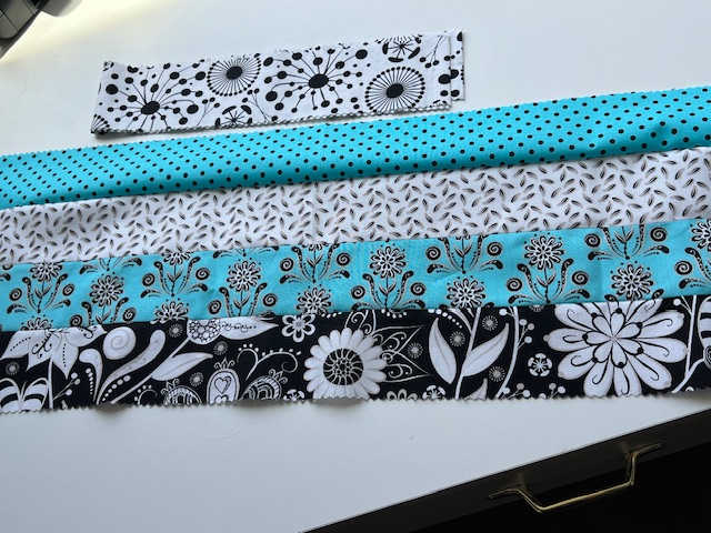- Finish sewing final rail fence strip set and subcutting into 4 – 10 inch blocks