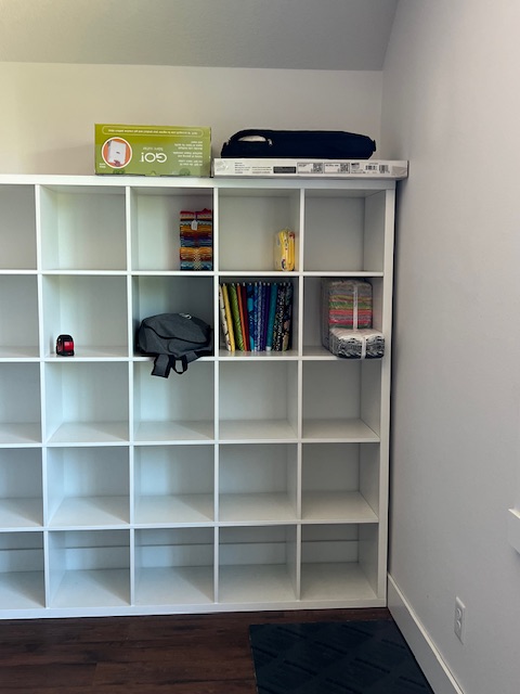 Last week I showed you the long arm setup in my California room and taked about the retrofit. I thought I would show you what the current Long Arm room looks like before it is reassembled. Walk carefully around the room! I did move the cross stitch supplies to this room because I feel that overall there will be more room in this one as it is bigger and I just have to many projects in the other room. I have been toying with how to put the fabric in my Ikea bookshelves. Not much progress yet.