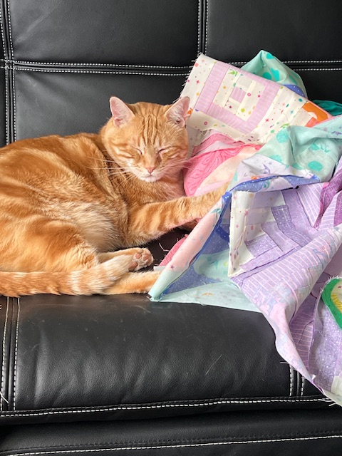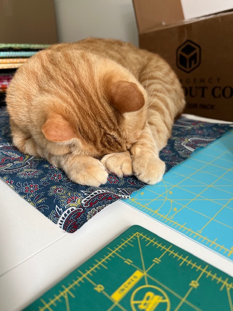 We made it to the end of my photos on quilting acronyms so today I share Nala with you. I have found a 95% sure way to get her to lay where I want her to lay (anywhere but on my project please!). I can give her a design board or a project to lay on. Here she is laying on the quilted back of a future project bag. I have not had as much success with distracting Simba. This week he split him time laying on the futon or next to the sewing machine (with his tail under my pressure foot).