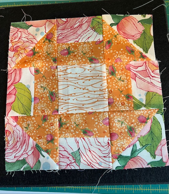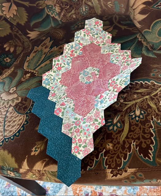 - Due to the heat, I pulled out my english paper piecing project Ruby’s Garden and almost finished block 15 here. The center of this block is Liberty fabrics which seem so delicate compared to the sashing fabric of quilters cotton.