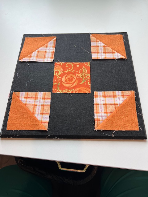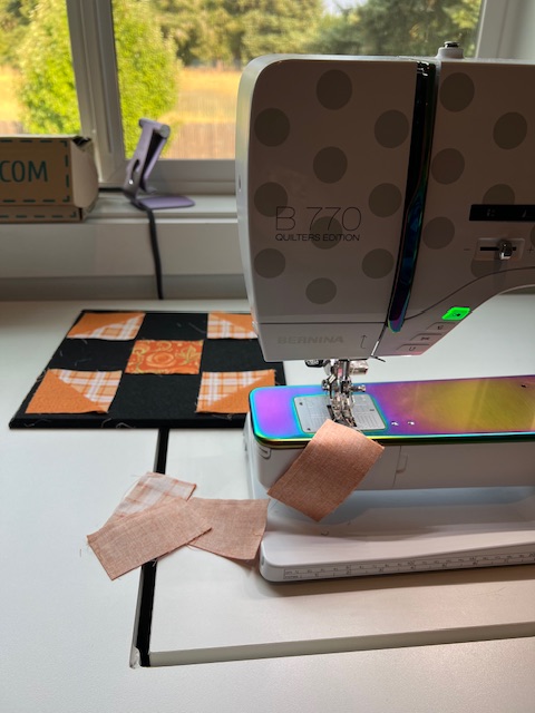 While working on the mystery quilt, my go to leaders and enders project is my churn dash blocks that I precut almost 2 years ago now. This orange one is very colorful!