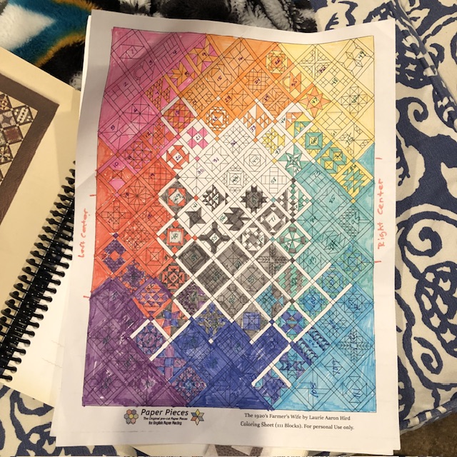I am still following my original color sheets with ths color wash english paper piecing quilt. I am not even sure where these got off to. I did them back in 2017 when I started this project – my first EPP quilt. Why did I pick such a big project? A question I ask myself often. Definitely have learned a lot about utting together quilt blocks. I don’t know if you can tell but I am working on the block on the edge second from the bottom.